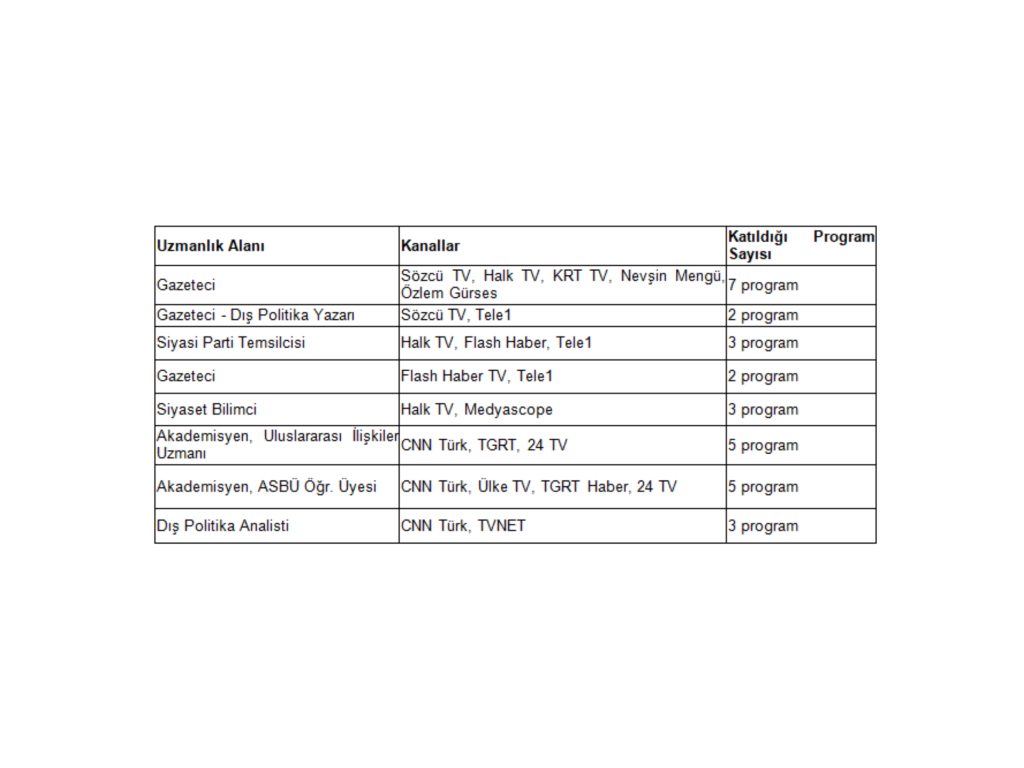 Yaptığımız taramada dış politikacı kadın uzman sayısı yüksek çıktı. 150 kez gözüken kadın konuklar, 56 kere dış politika konusunda uzmanlıklarıyla değerlendirmelerde bulundular ve akademisyen, siyasetçi ve gazeteci olarak programlara katıldılar. Ancak taramanın yapıldığı dönemin İsrail Filistin savaşının sıcak gündemini göz önünde bulundurmak gerekir. İsrail-Filistin arasındaki çatışma değerlendirilirken konuk olarak çağrılan kadınları bazen aynı gün birden fazla kanalda gördük. Bu da konu hakkındaki uzmanların sayısının az olabileceğini, ya da alandaki uzmanların medyadaki tanınırlığının düşük olabileceğini gösteriyor.